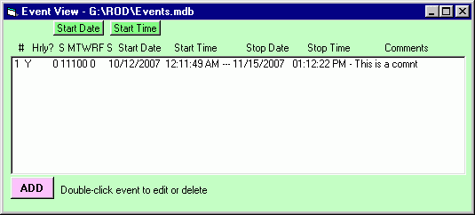 From the MAIN SCREEN, click the green VIEW EVENTS button. It will open the above screen. Initially (when no events have been created) the screen will be blank. Any events already in the database can be sorted by date or time format by clicking on the corresponding buttons labeled TIME and DATE. To add an event, click on the ADD button, and the screen below will appear.