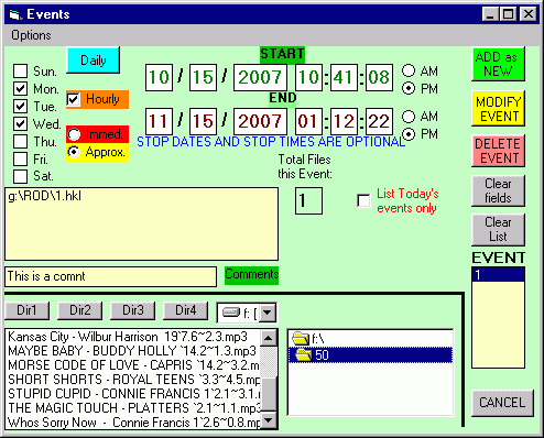 Automatronix contains a fully programmable event scheduler. The operator can program events during playing. Each event can contain up to 15 separate and distinct files that will play consecutively. Each event must contain a START TIME and START DATE, and at least a single FILE ENTRY to play. All other functions are optional and affect how the event is run. Once an event is scheduled, and activated by the EVENTS ON check mark is selected on the MAIN MENU, and the MODE is one of the AUTO MODE's, it will run at the programmed time and date specified. Events can be set to run a multiple of times, dates, hourly ranges, etc. so that maximum flexibility can be obtained. Once an event is SAVED into the database, it can be DELETED or MODIFIED.