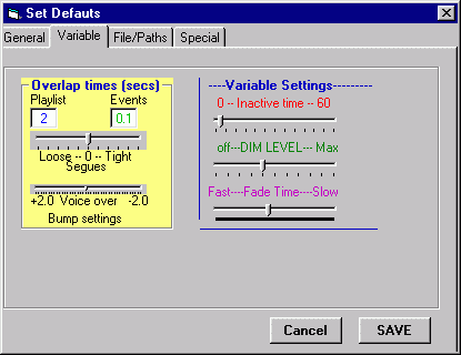 OVERLAP TIME (PLAYLIST & EVENT) -Changing this number sets the system overlap time on the playlist and eventlist. The factory default setting for both is 0.1, and this is the minimum setting, NOTE- This setting is over-ridden if a file contains an overlap time already programmed into it. The higher the number, the sooner the files will overlap before they end. NOTE- It is recommended that each file is independently tagged. That way, each song has its' own unique time, and makes the transition more natural.
